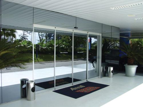 自动门感应器探测到有人进入时,将脉冲信号传给主控器,主控器判断后通知马达运行,同时监控马达转数,以便通知马达在一定时候加力和进入慢行运行。马达得到一定运行电流后做正向运行,将动力传给同步带,再由同步带将动力传给吊具系统使门扇开启;门扇开启后由控制器作出判断,如需关门,通知马达作反向运动,关闭门扇。